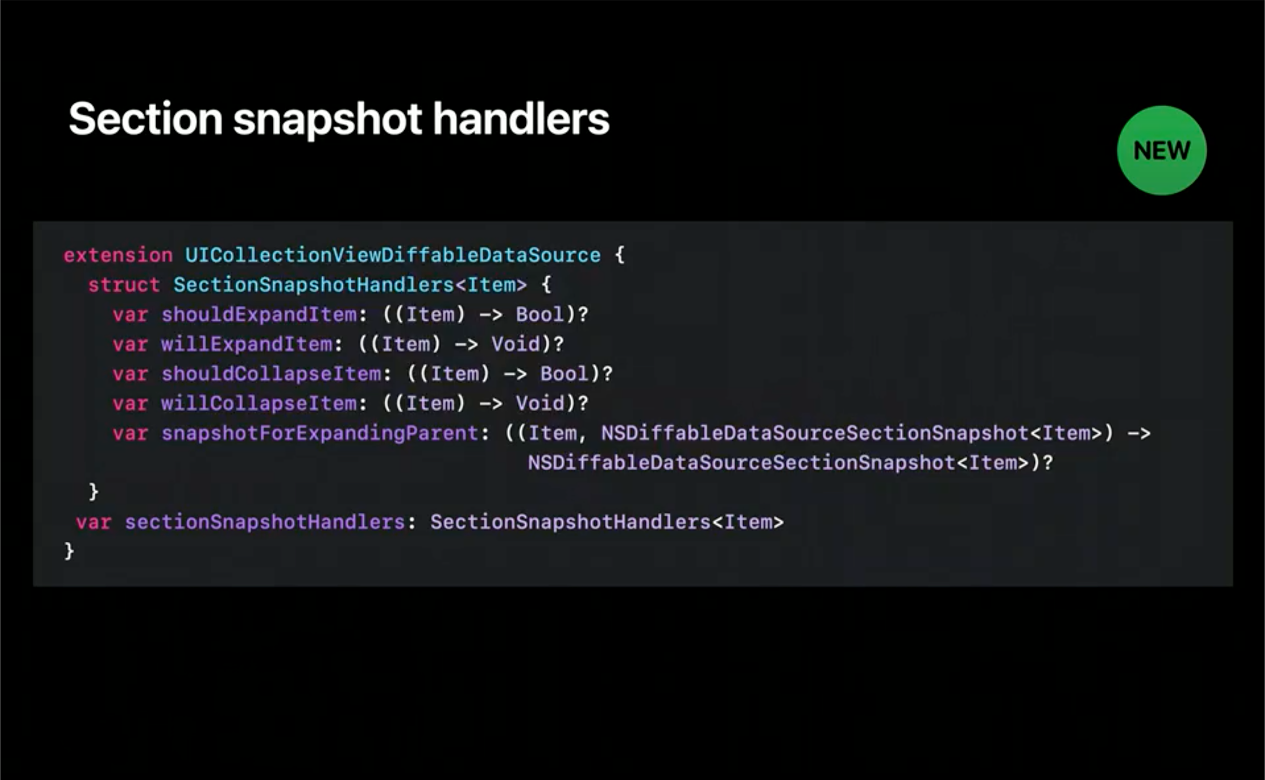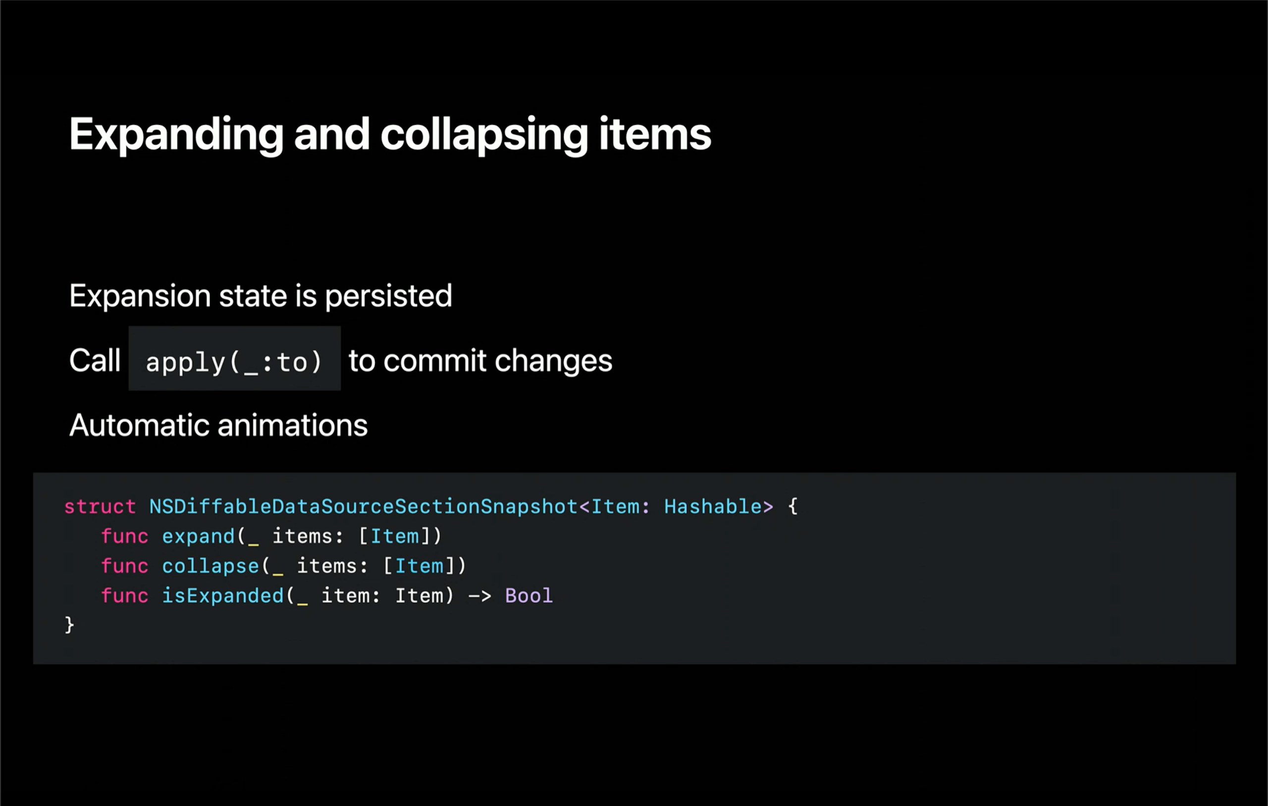 이를 지원하기 위해 Diffable Data Source에는 애플리케이션이 사용자 상호 작용으로 인한 확장 상태 변경을 프로그래밍 방식으로 제어 할 수있는 새로운 API가 있습니다.