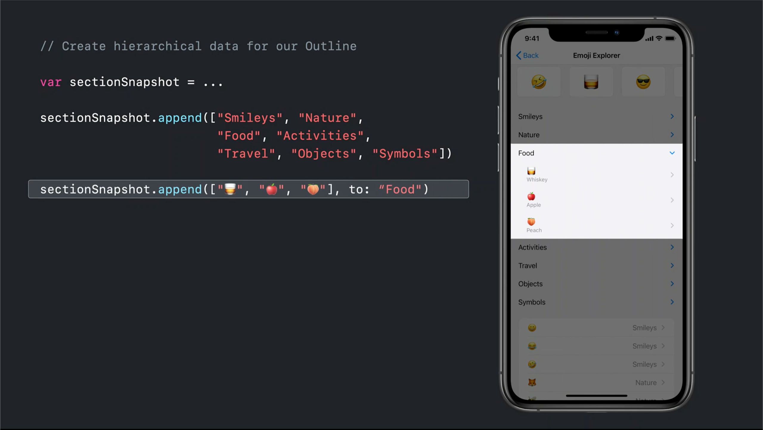 - outline-style UI 렌더링(iOS14 전체에서 볼 수 있는 공통적인 시각적인 디자인)을 지원하는 데 필요한 계층적 데이터 모델링을 허용하기 위해서 입니다.