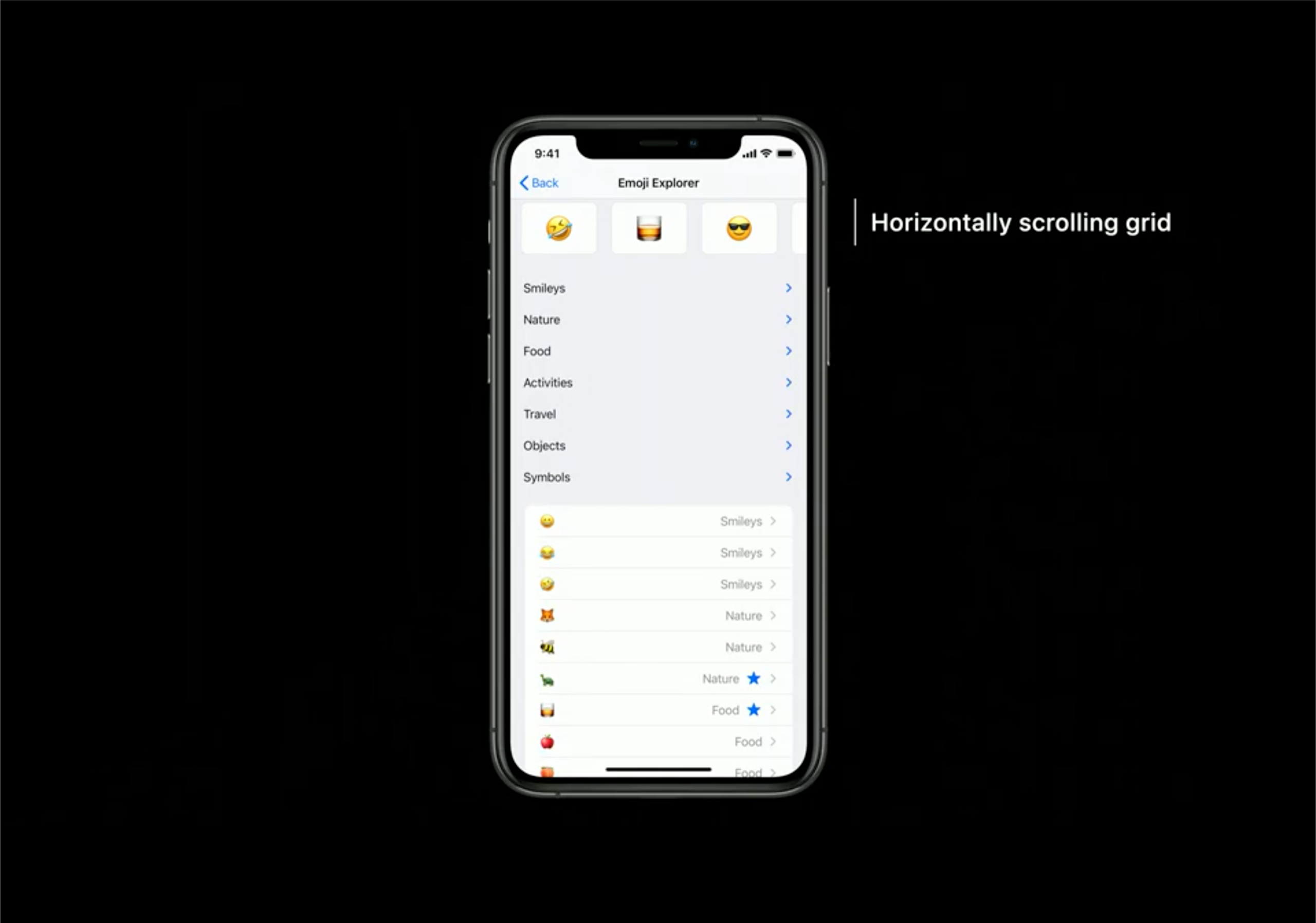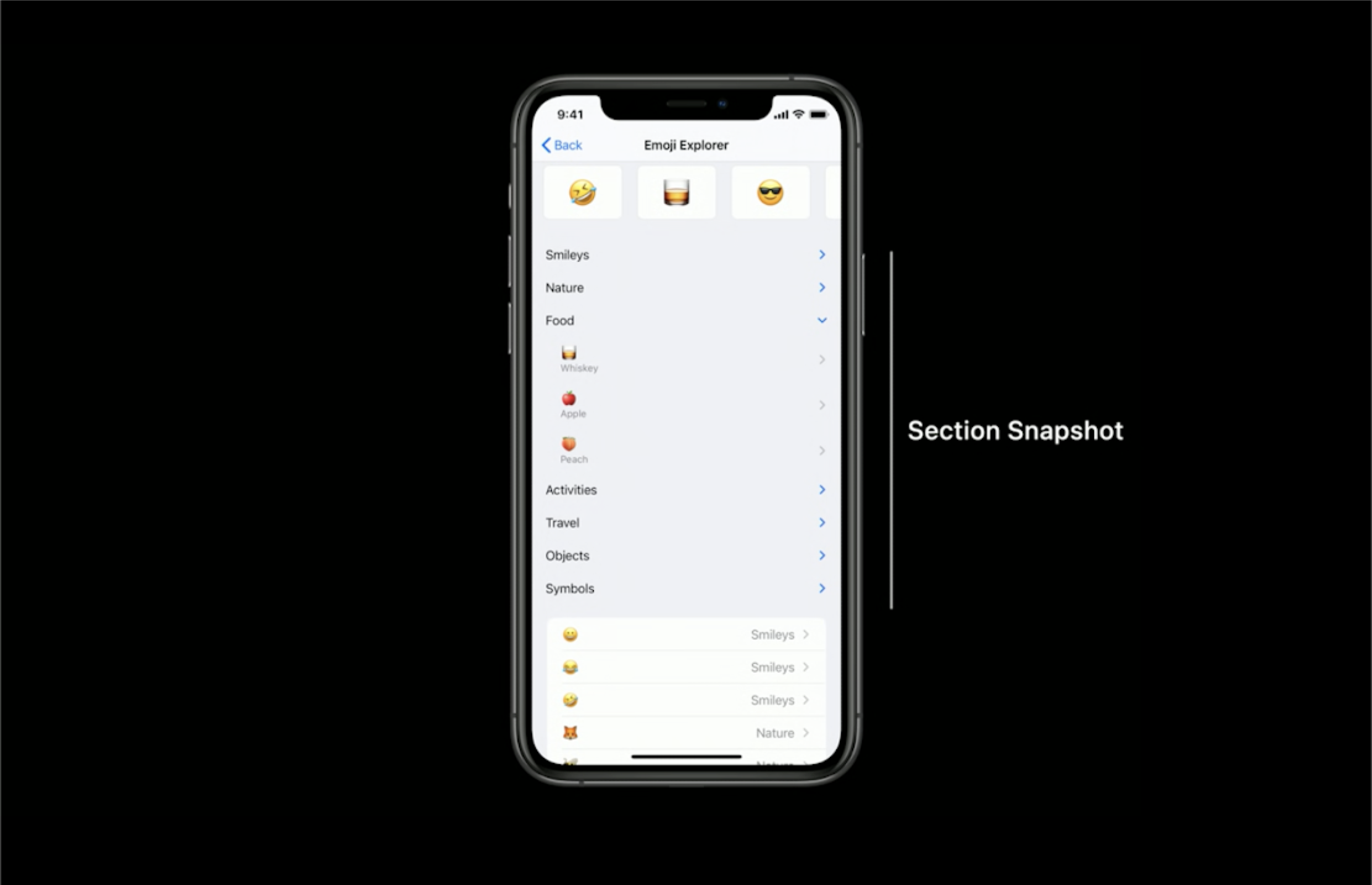 따라서 Emoji Explorer의 경우 단일 섹션의 내용을 각각 나타내는 3 개의 개별 section snapshot에서 Diffable Data Source를 구성합니다.
