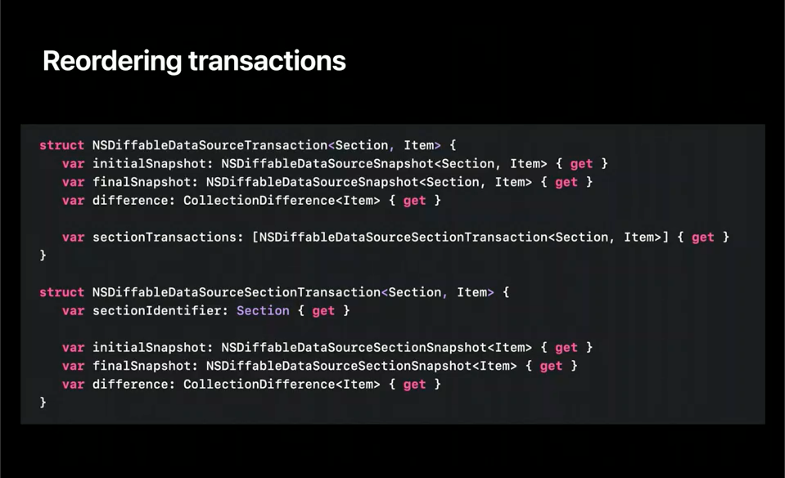 이 API를 WWDC 2019 비디오 "Advances in UI Data Sources"에서 자세히 다루었으며 자세한 내용을 보려면 해당 비디오를 확인하는 것이 좋습니다.