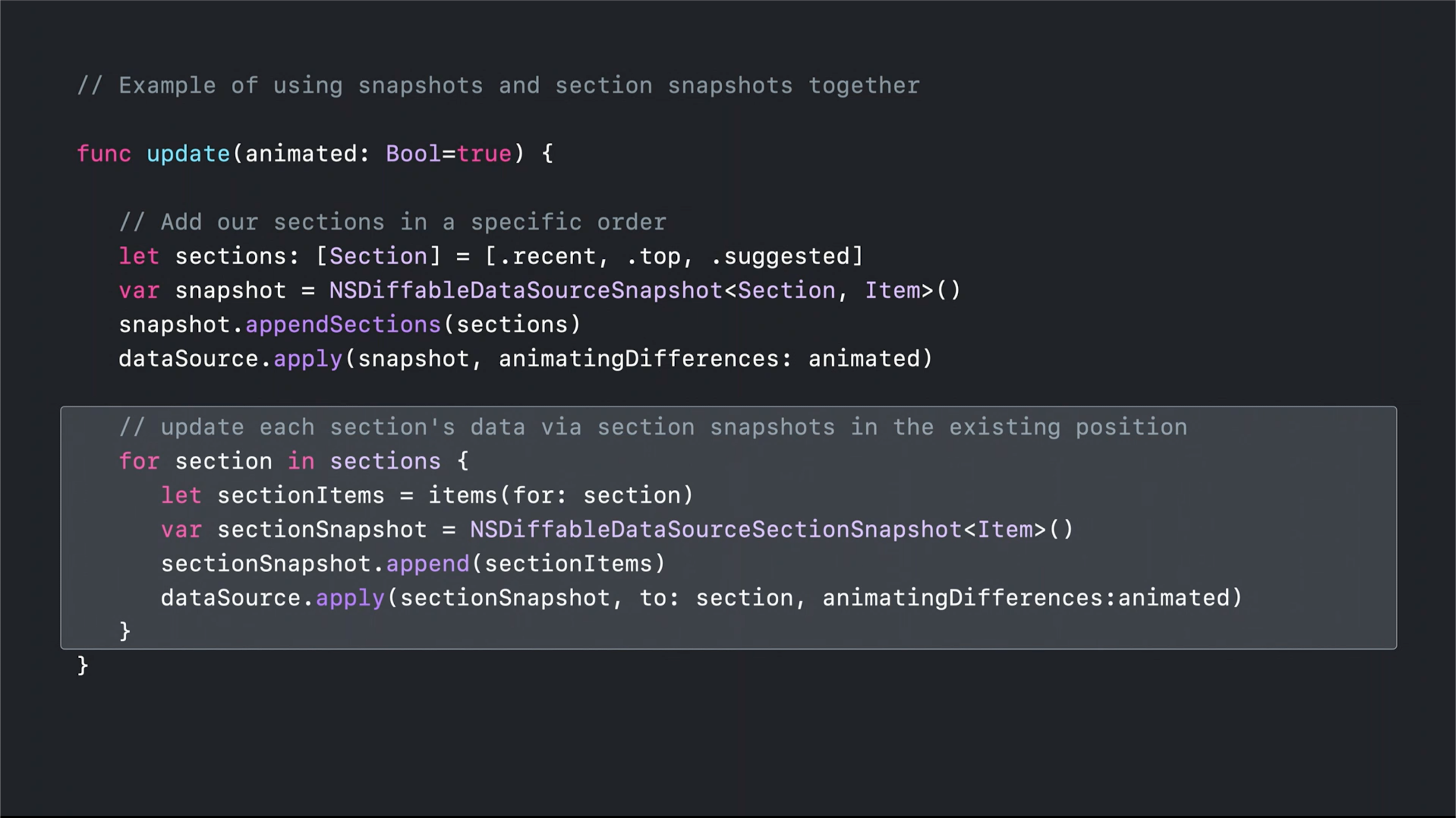 iOS 14의 경우 Diffable Data Source의 기반에서 두 가지 새로운 기능인 Section snapshot과 일급 Reordering 지원을 구축했습니다.
