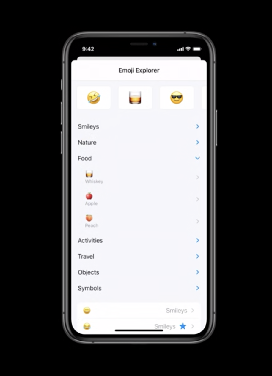 와 훨씬 비슷한 모양이 있습니다. 또한 각 셀을 스와이프하여 좋아하는 이모지를 표시 할 수도 있습니다. 여기에 표시되는 것은 List와 Compositional Layout의 조합을 사용하는 단일 컬렉션 뷰입니다.