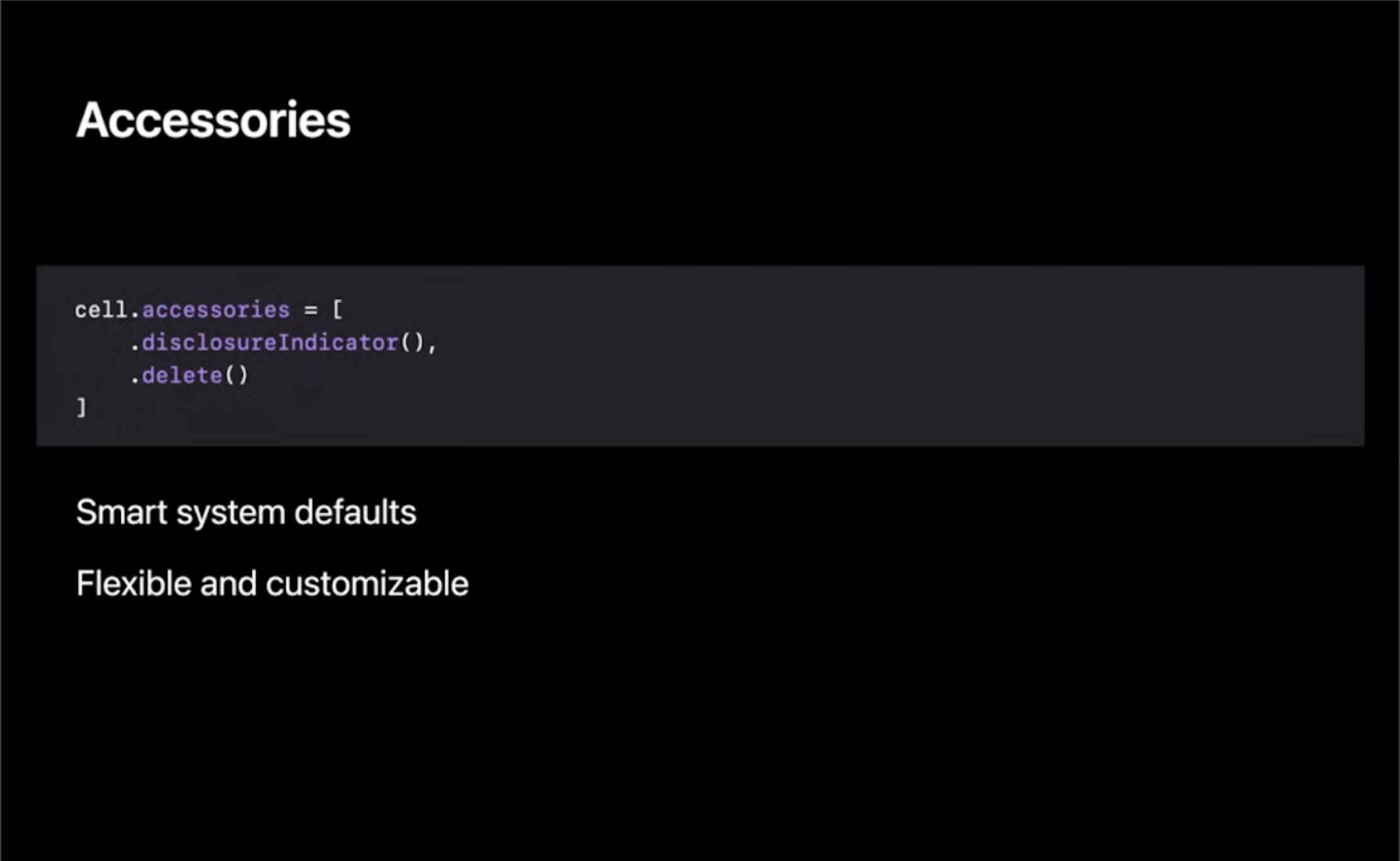 또한 액세서리 API가 대폭 향상되었으며 'Modern Cell Configuration' 비디오에서 모두 배울 수 있는 기본 시스템 컨텐츠 및 배경 구성에 액세스 할 수 있습니다.